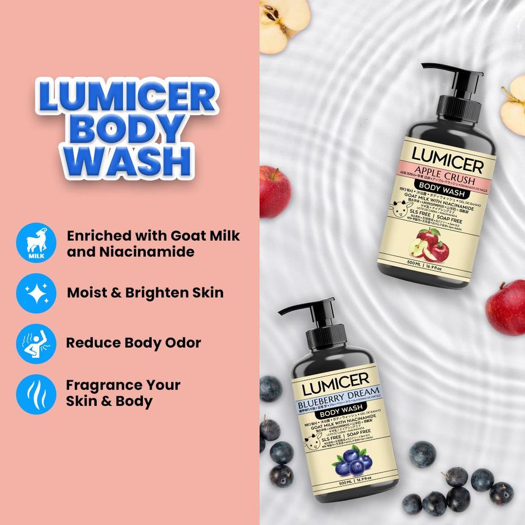 APPLE & BLUEBERRY LUMICER BODY WASH (BUY 1 GET 1) 2 X 500 ML – SABUN MENCERAHKAN MELEMBAPKAN ATASI BAU BADAN, NON SLS GOAT MILK & NIACINAMIDE
