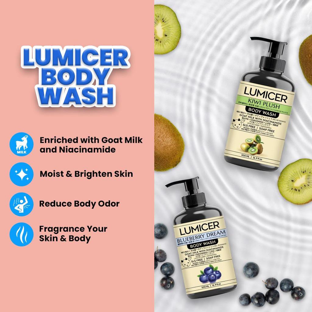 KIWI & BLUEBERRY LUMICER BODY WASH (BUY 1 GET 1) 2 X 500 ML – SABUN MENCERAHKAN MELEMBAPKAN ATASI BAU BADAN, NON SLS GOAT MILK & NIACINAMIDE
