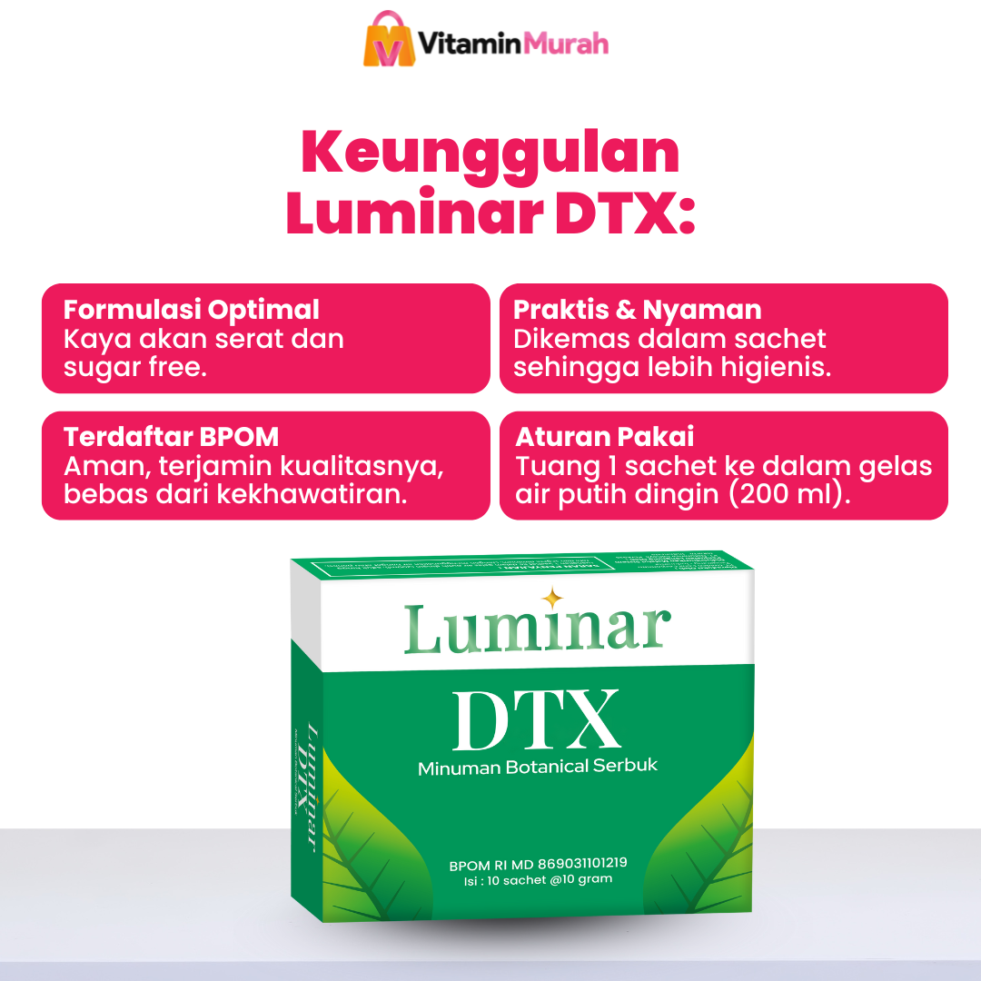Luminar DTX diformulasikan dengan kombinasi Spirulina, Chromium Picolinate, Oligofruktosa dan Psyllium Husk