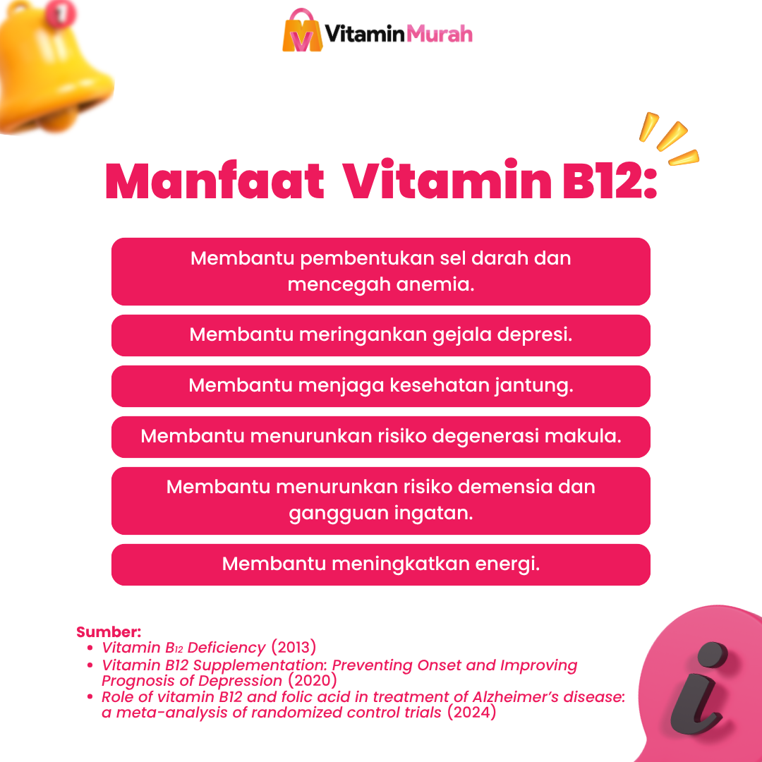 – Membantu Meringankan Gejala Depresi. Vitamin B12 mendukung pembentukan serotonin, neurotransmiter yang berperan penting dalam menstabilkan suasana hati. Kekurangan B12 dapat menyebabkan perubahan mood dan depresi, sementara suplemen B12 dapat mempercepat pemulihan bersama pengobatan lainnya.