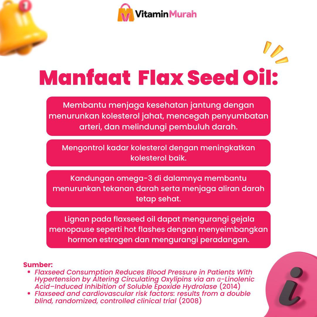 – Membantu Mengontrol Tekanan Darah. Kandungan omega-3 dalam flaxseed oil membantu menurunkan tekanan darah sekaligus meningkatkan elastisitas pembuluh darah, mendukung aliran darah yang sehat dan stabil.