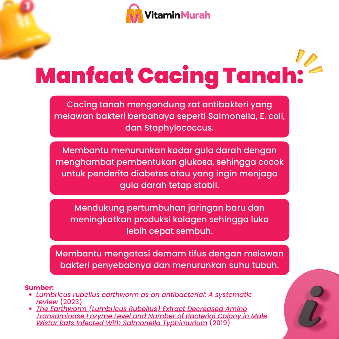 – Meningkatkan Kekebalan Tubuh. Cacing tanah mengandung zat antibakteri yang melawan bakteri berbahaya seperti Salmonella, E. coli, dan Staphylococcus. Enzim lumbrokinase juga membantu melancarkan aliran darah, sehingga tubuh lebih kuat melawan infeksi.