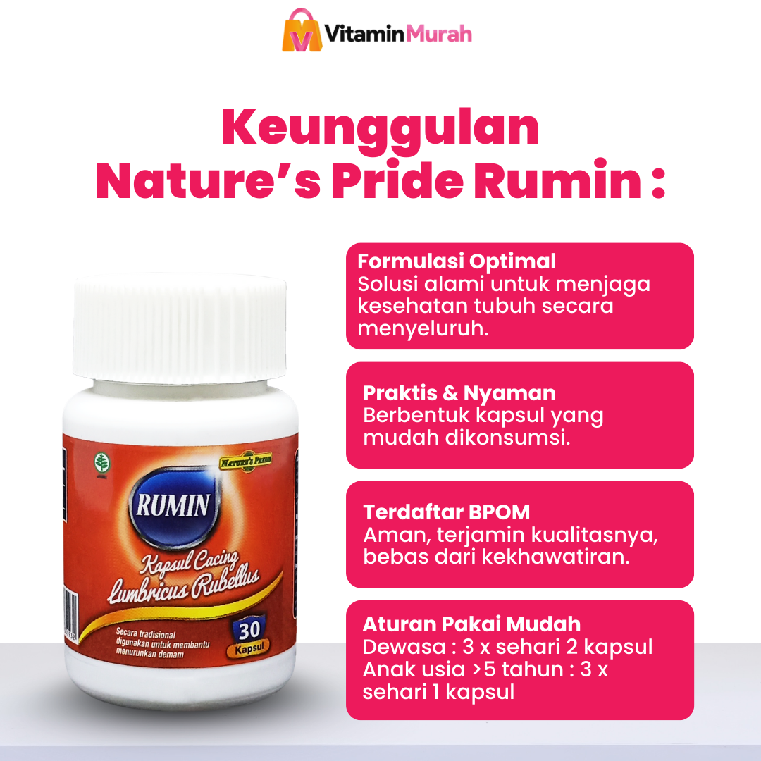Nature’s Pride Rumin mengandung ekstrak Lumbricus Rubellus 500 mg. Lumbricus Rubellus atau cacing tanah mempunyai manfaat :