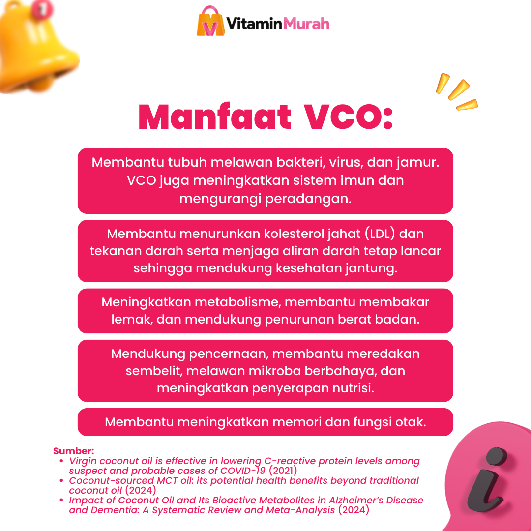 – Menjaga Kesehatan Pencernaan. VCO mendukung pencernaan, membantu meredakan sembelit, melawan mikroba berbahaya, dan meningkatkan penyerapan nutrisi, menjaga saluran pencernaan tetap sehat.