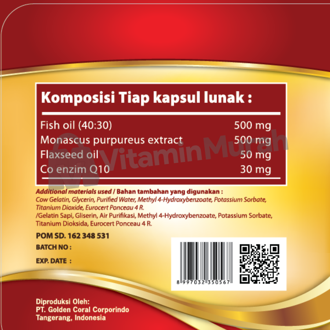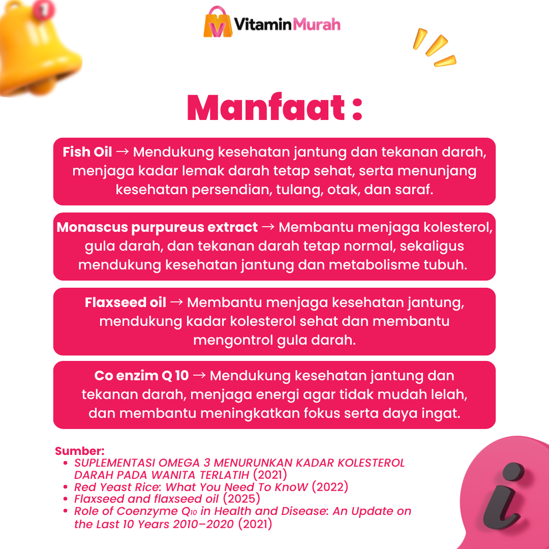 Monascus purpureus extract 500 mg, Flaxseed oil 50 mg dan Co enzim Q 10 30 mg, yang masing-masing memiliki manfaat :