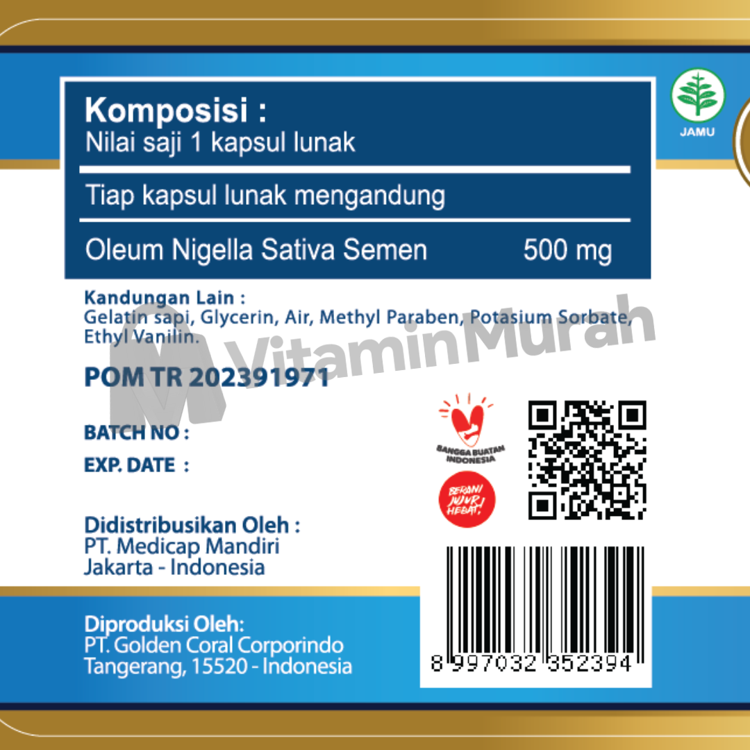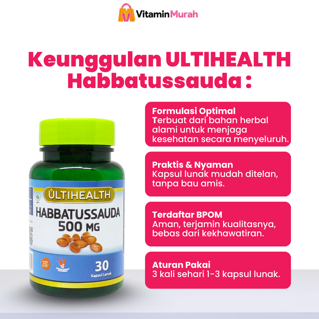 Ultihealth Habbatussauda mengandung Habbatussauda 500 mg. Habbatussauda (Nigella sativa) adalah bahan alami yang kaya manfaat untuk mendukung kesehatan tubuh. Berikut manfaat utama habbatussauda :