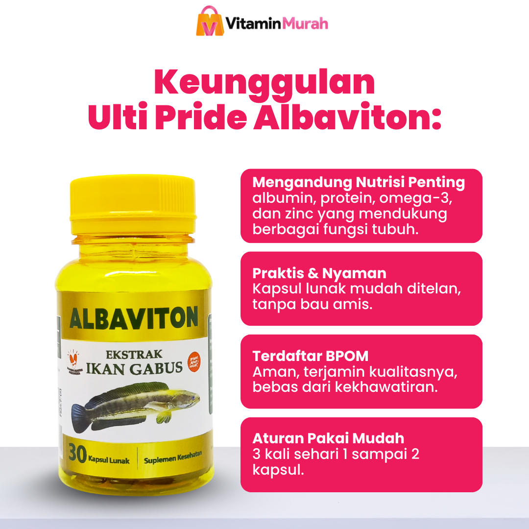 Ulti Pride Albaviton mengandung Ekstrak Ikan Gabus sebesar 500 mg. Ikan gabus memiliki manfaat sebagai berikut :