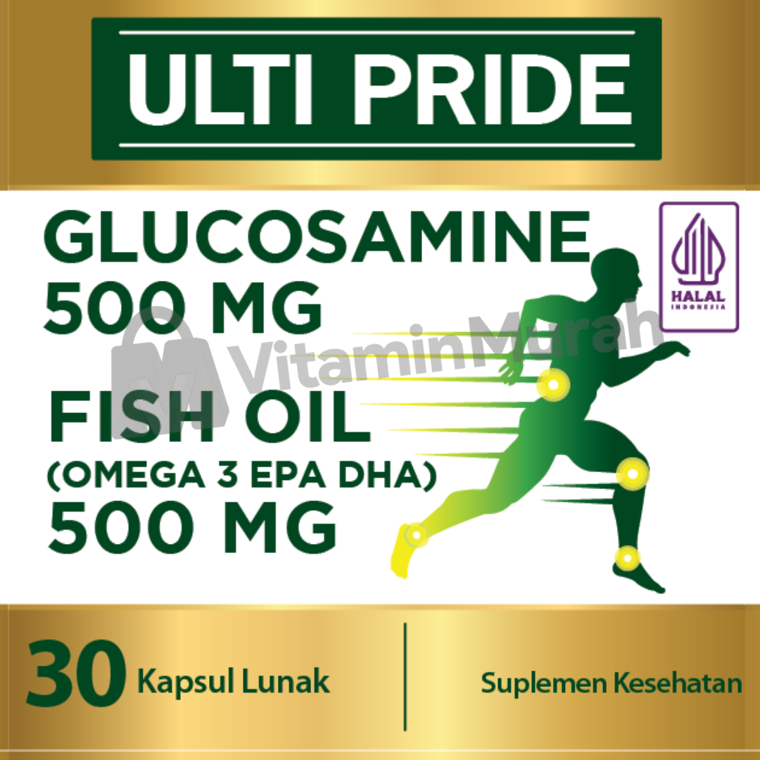 Ulti Pride Glucosamine Fish Oil Omega mengandung Glukosamin 500 mg dan Fish Oil 500 mg. Kombinasi Glukosamin dan Fish Oil memiliki manfaat :