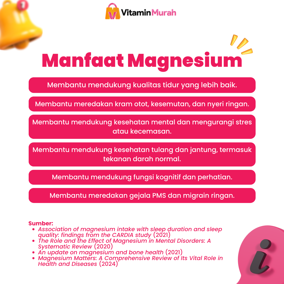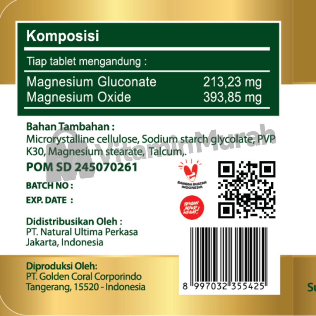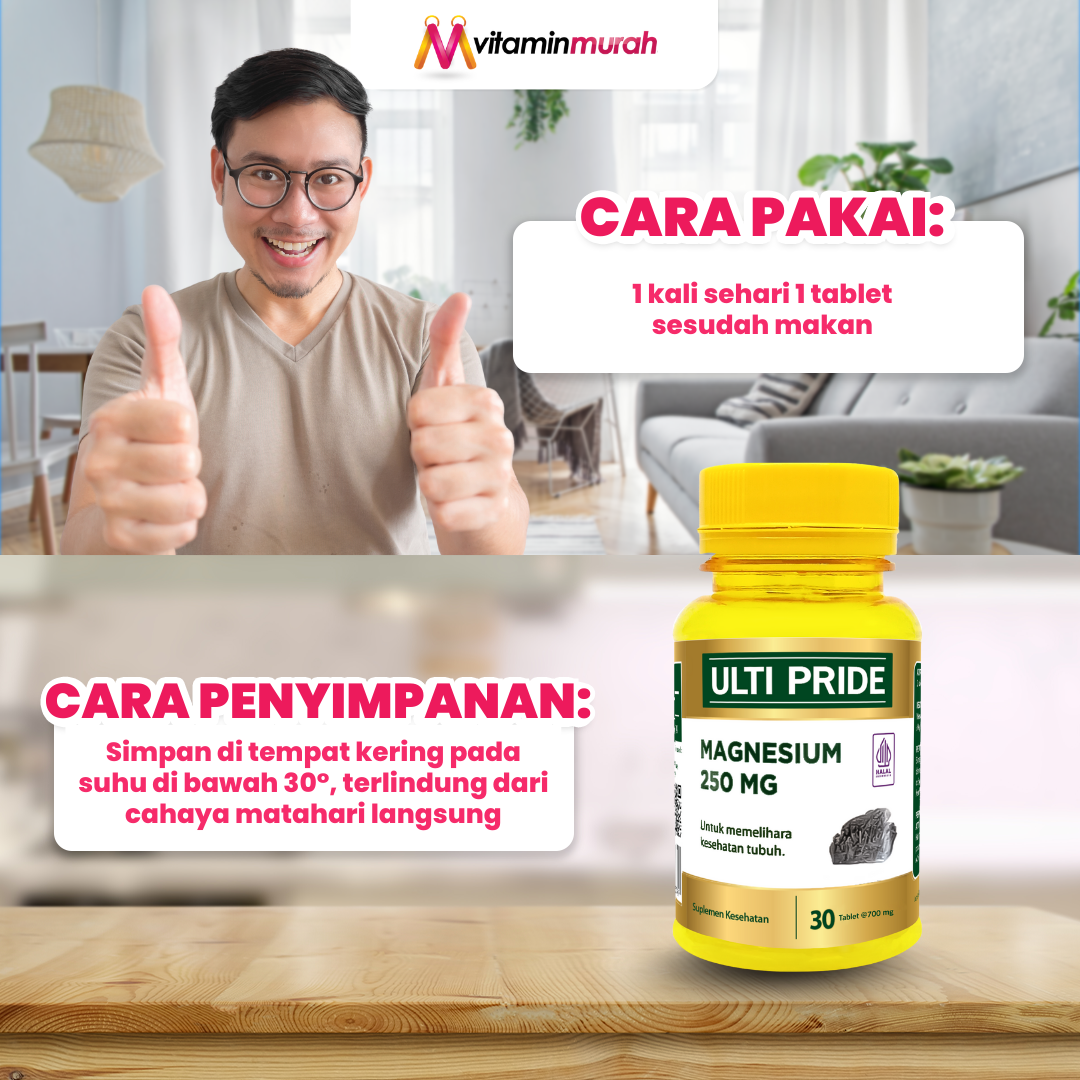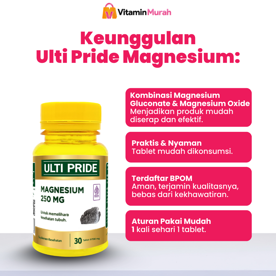Ulti Pride Magnesium – Solusi Lengkap untuk Kesehatan Tubuh dan Performa. Ulti Pride Magnesium mengandung Magnesium Gluconate 213,23 mg dan Magnesium Oxide 393,85 mg, setara dengan Magnesium 250 mg, yang dirancang untuk menjaga kesehatan tulang dan gigi, mendukung kesehatan otot, jantung, dan fungsi saraf. Produk ini juga bermanfaat untuk meningkatkan stamina, peforma olahraga, dan mendukung fungsi seksual pria, serta meringankan gejala PMS dan migrain. Dengan kombinasi Magnesium Gluconate dan Magnesium Oxide, produk ini menawarkan penyerapan optimal dan efektivitas lebih tinggi. Magnesium Gluconate memiliki tingkat penyerapan yang lebih baik oleh tubuh, sementara Magnesium Oxide memberikan dosis lebih tinggi, ideal untuk mendukung fungsi tubuh yang lebih besar. Nature’s Pride Magnesium adalah pilihan tepat untuk kebutuhan magnesium Anda, dan sudah terdaftar di BPOM, menjamin kualitas dan keamanannya.