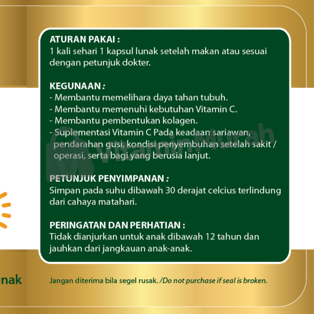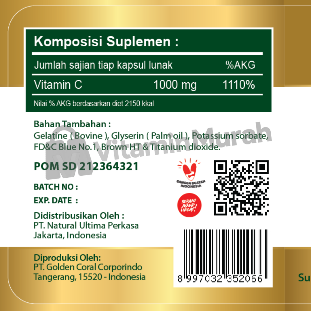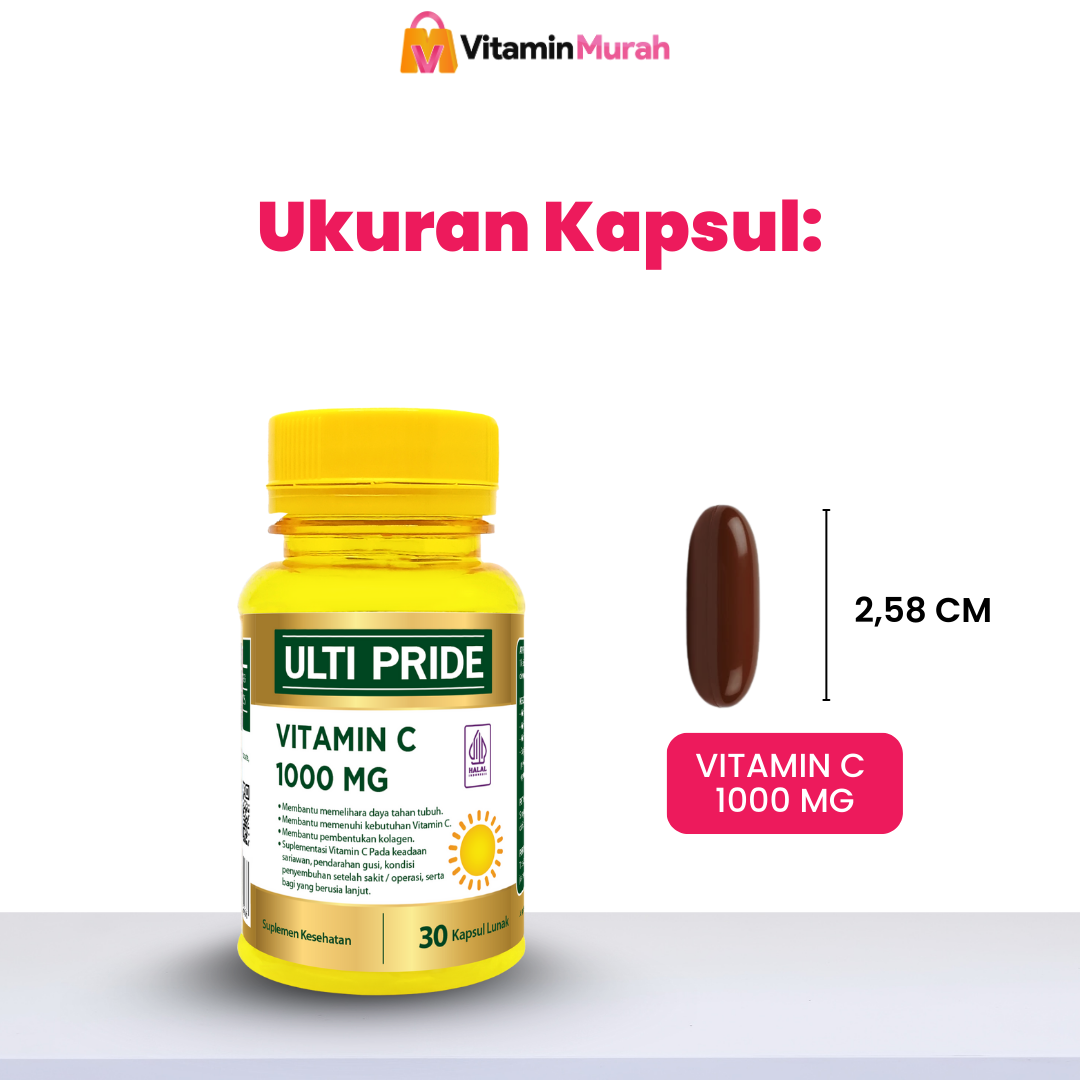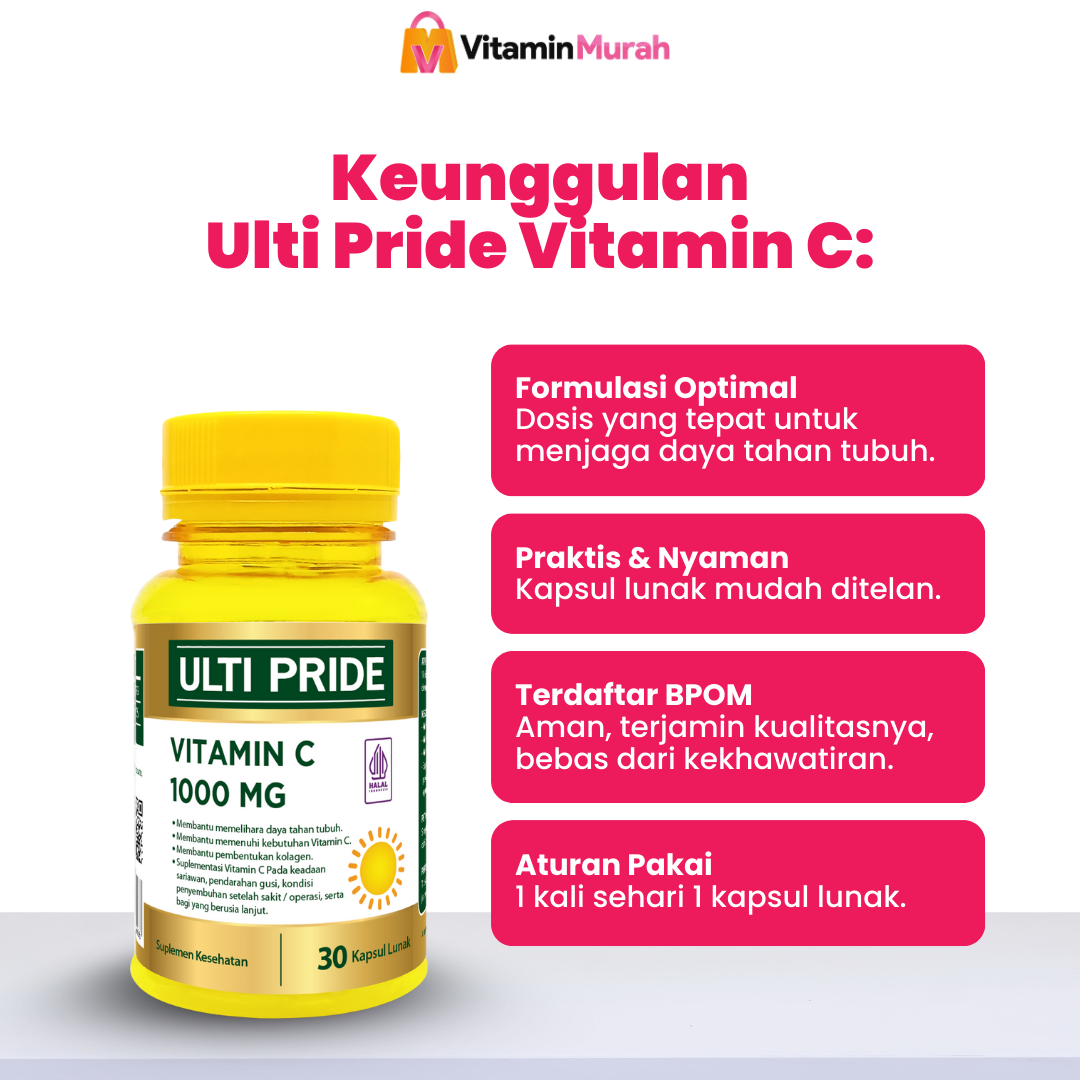 Ulti Pride Vitamin C 1000 mg, mengandung Vitamin C 1000 mg yang cukup ramah di lambung dan cukup konsumsi 1 x sehari. Vitamin C dikenal dapat membantu meningkatkan daya tahan tubuh dengan membantu meningkatkan fungsi sistem imun dengan mendukung aktivitas sel darah putih, seperti limfosit dan fagosit, yang bertugas melawan infeksi. Vitamin C juga dikenal sebagai antioksidan kuat yang dapat melindungi tubuh dari paparan radikal bebas, yang berkontribusi pada penuaan dan juga penyakit kronis. Vitamin C dapat membantu pembentukan hemoglobin dengan meningkatkan penyerapan zat besi dari makanan, yang diperlukan untuk produksi sel darah merah.