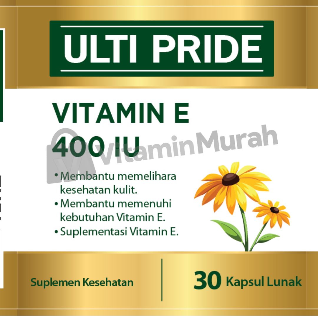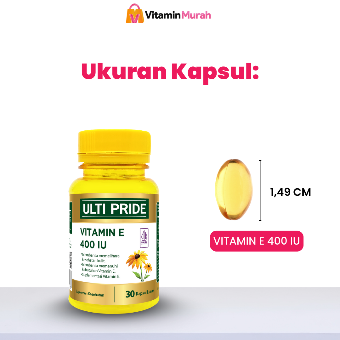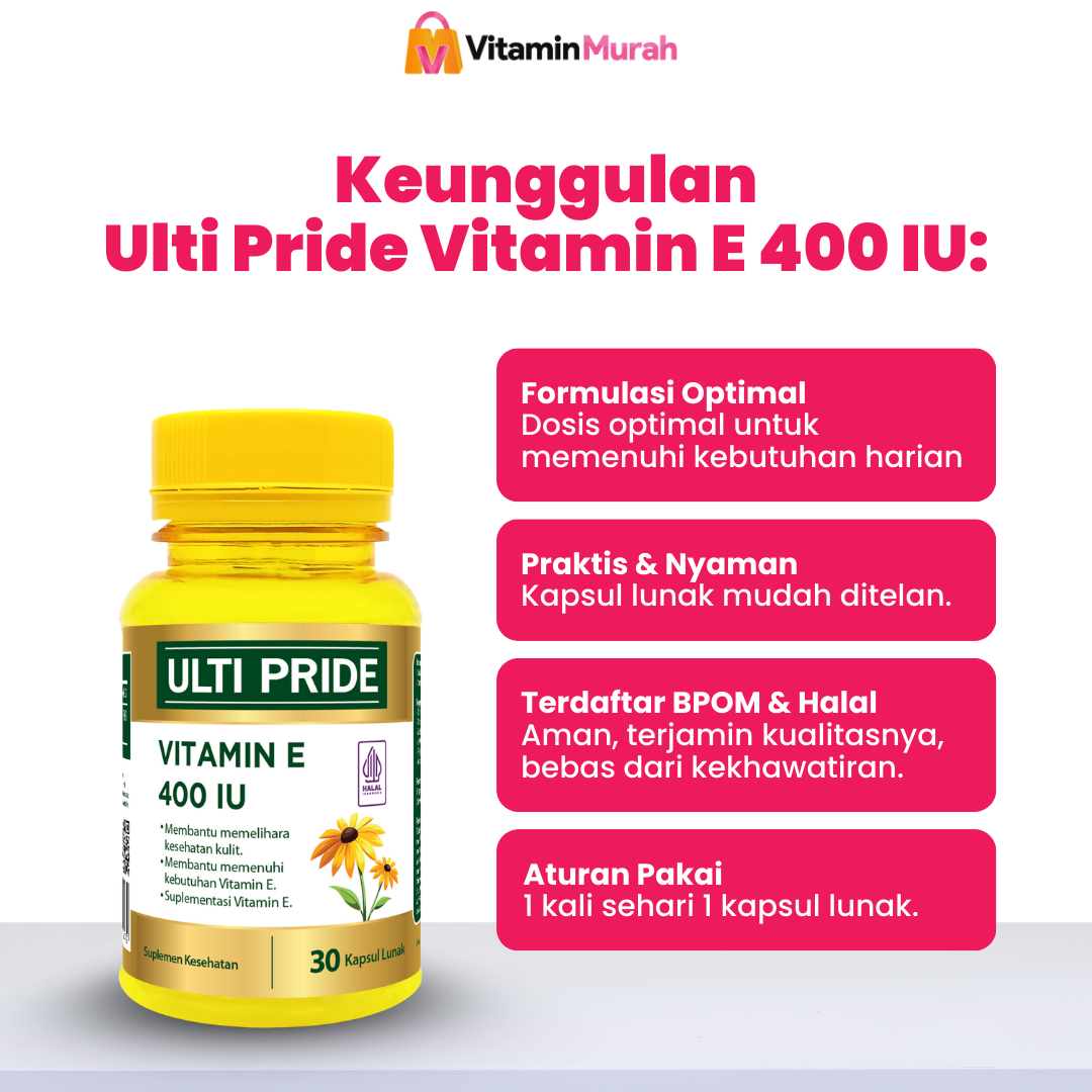 Ulti Pride Vitamin E mengandung Vitamin E sebesar 400 IU. Vitamin E termasuk dapat antioksidan kuat yang juga memliki manfaat sebagai berikut :