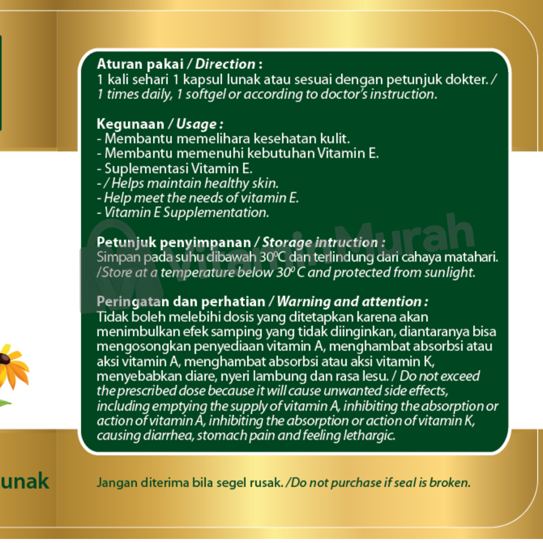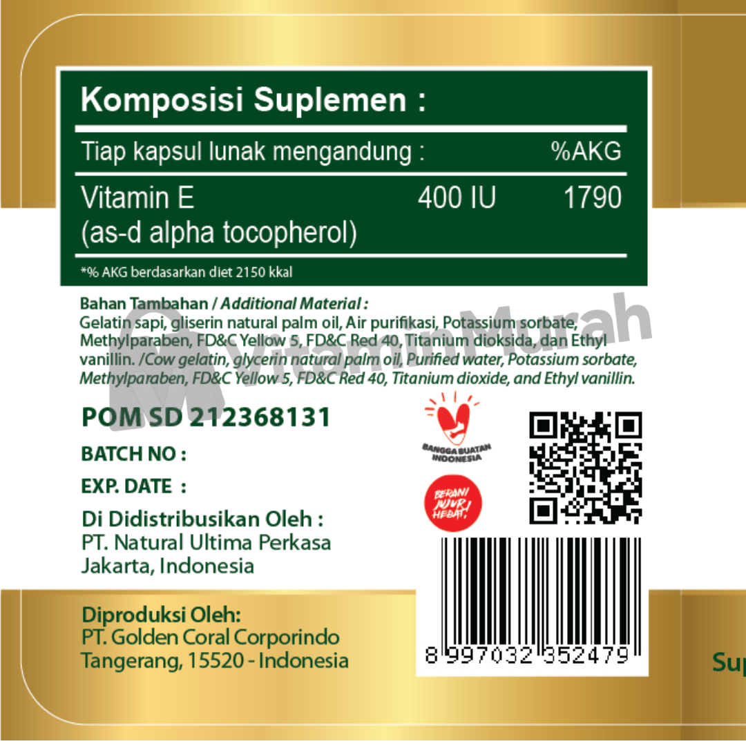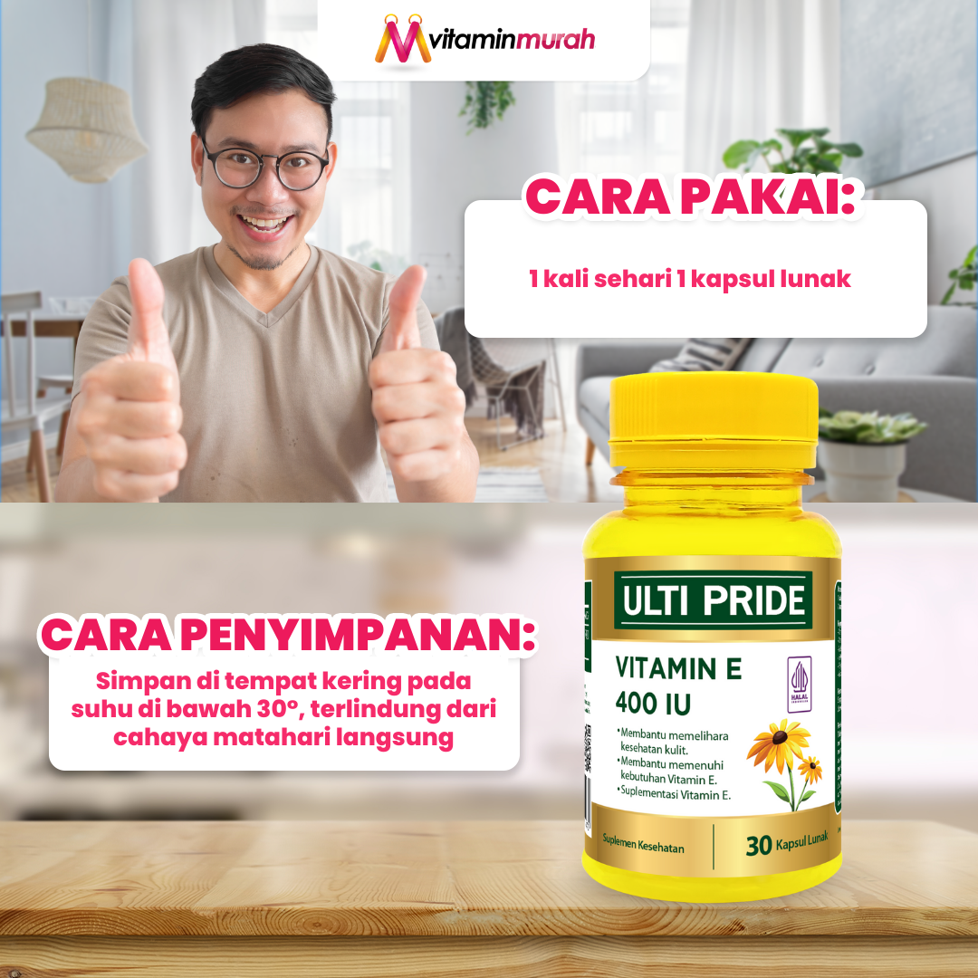 Ulti Pride Vitamin E mengandung Vitamin E sebesar 400 IU. Vitamin E termasuk dapat antioksidan kuat yang juga memliki manfaat sebagai berikut :