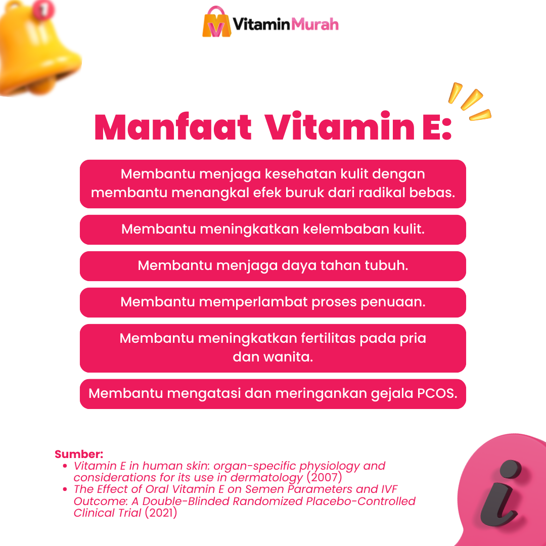 – Membantu Menjaga Kesehatan Kulit. Vitamin E adalah antioksidan yang melindungi kulit dari kerusakan akibat radikal bebas dan sinar UV. Vitamin E juga dapat membantu menjaga kelembapan kulit, meningkatkan elastisitas, dan memperlambat tanda-tanda penuaan dini.