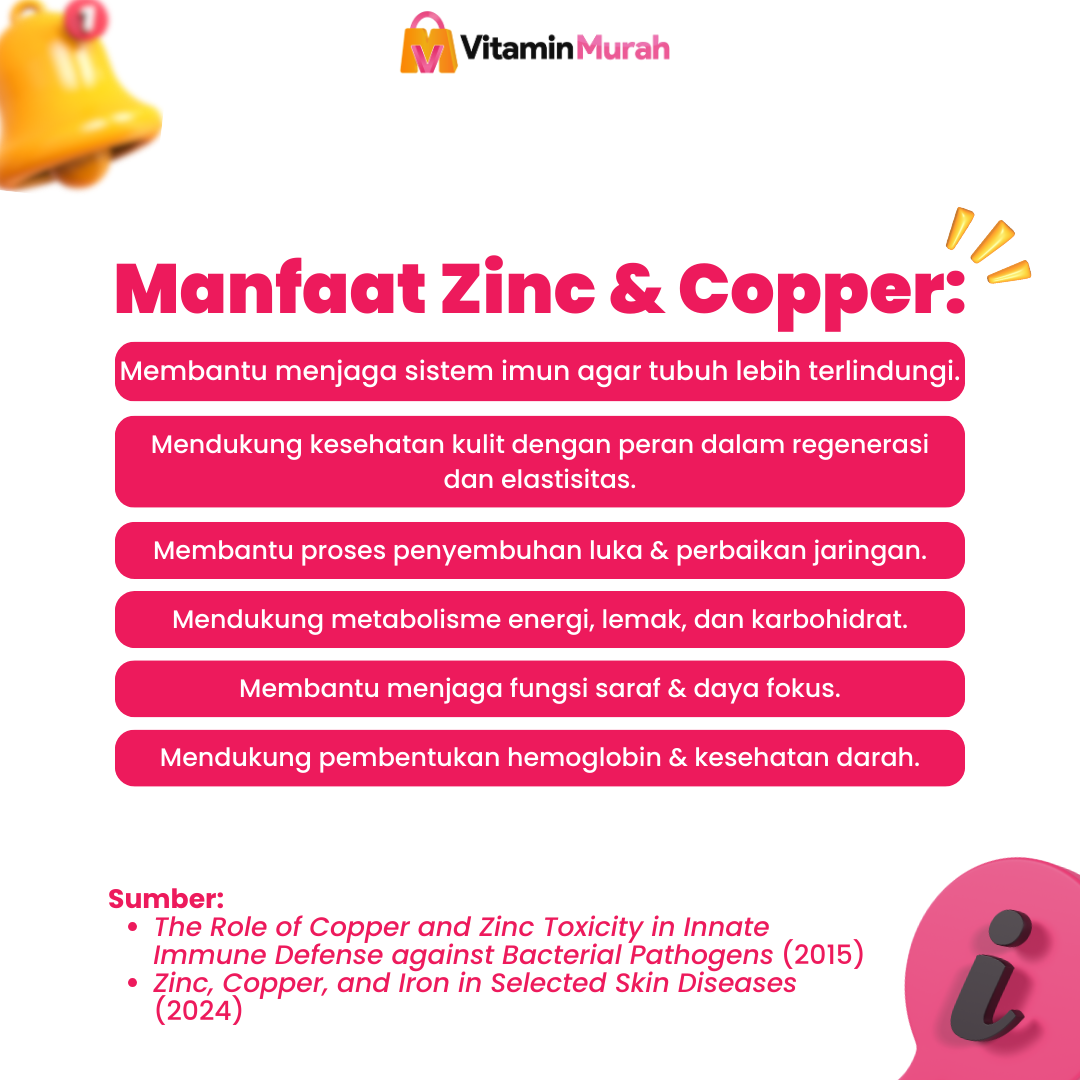 – Membantu Menjaga Kesehatan Jantung. Zinc membantu menurunkan kadar kolesterol total, LDL (kolesterol jahat), dan trigliserida dalam darah, sehingga mendukung kesehatan jantung dan mencegah risiko penyakit kardiovaskular. Kombinasi zinc dan copper juga berfungsi melindungi pembuluh darah dari kerusakan oksidatif.